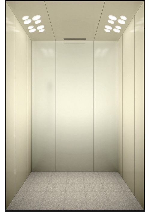 轎廂型號:YG-1622  天井:白色砂紋噴漆板(YG-05)+鏡面不銹鋼  兩側(cè)、后側(cè)板:兩側(cè)香檳色砂紋鋼板(YG-07),后側(cè)香檳色砂紋鋼板(YG-07)+深咖色砂紋烤漆板(YG-08)+鏡面飾條  前側(cè)板、門楣:緞紋不銹鋼  轎門:緞紋不銹鋼  地板:FL-P34(米黃PVC)  操作盤:BD-D2F1