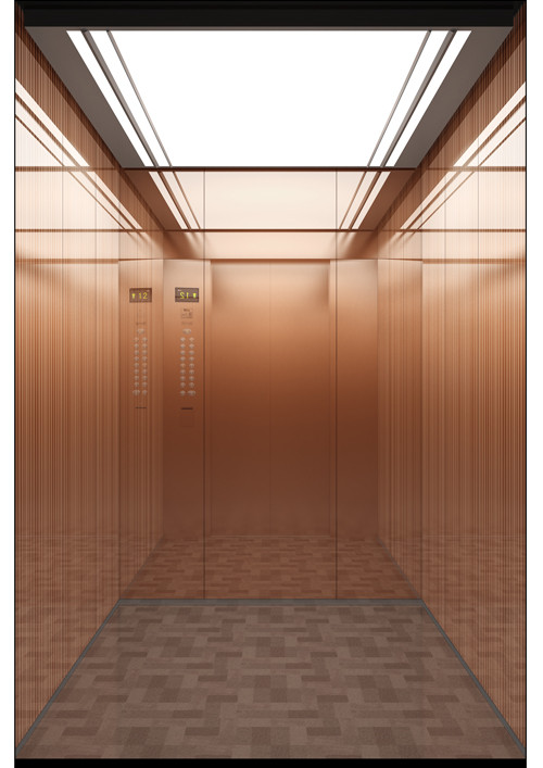 轎廂型號:YT-4649  天井:SKY-WD,金屬烤漆(YM-14)  兩側、后側板:兩側鏡面蝕刻(HM-0142)鍍古銅色,后側鏡面鍍古銅色  前側板、門楣:發紋鍍古銅色  轎門:發紋鍍古銅色  地板:PVC(FL-P29)  操作盤(一體式):顯示屏:7寸彩屏/其它:同BC-P2BT3