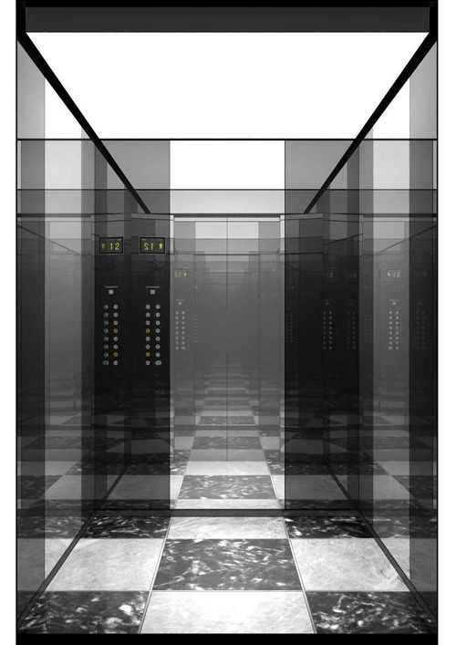 轎廂型號:YT-4690  天井:SKY-PU,軟膜天井  兩側(cè)、后側(cè)板:中間片鏡面不銹鋼,其余鏡面鍍黑鈦  前側(cè)板、門楣:鏡面不銹鋼鍍黑鈦  轎門:鏡面不銹鋼鍍黑鈦  地板:大理石拼花(FL-M14)  操作盤(一體式):BC-P5DT2